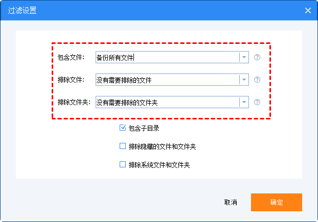 ? 包含文件:該選項框可以指定需要備份文件的格式。支持通配符并用分號分隔多個掩碼 (如*.doc;*.xls;*.ppt)。