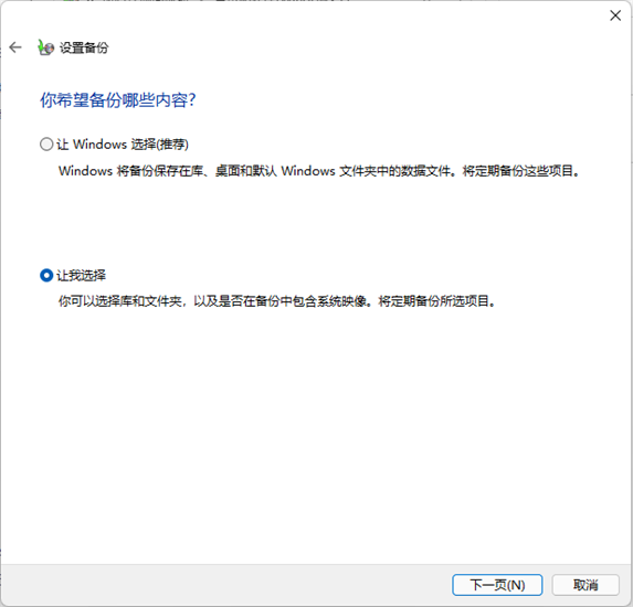 4.接下來,選擇要備份的內(nèi)容。選擇“讓我選擇”自定義要備份的文件,然后單擊“下一頁”。