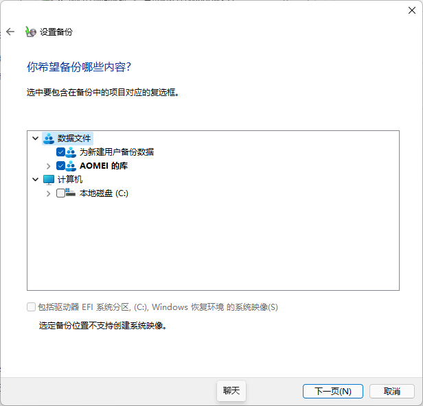 5.選中要包含在備份中的項目的復選框??梢哉归_目錄,選擇需要備份的文件夾。如果您不想創(chuàng)建Windows 11的系統(tǒng)映像,請取消選中包含系統(tǒng)的映像C盤選項框。