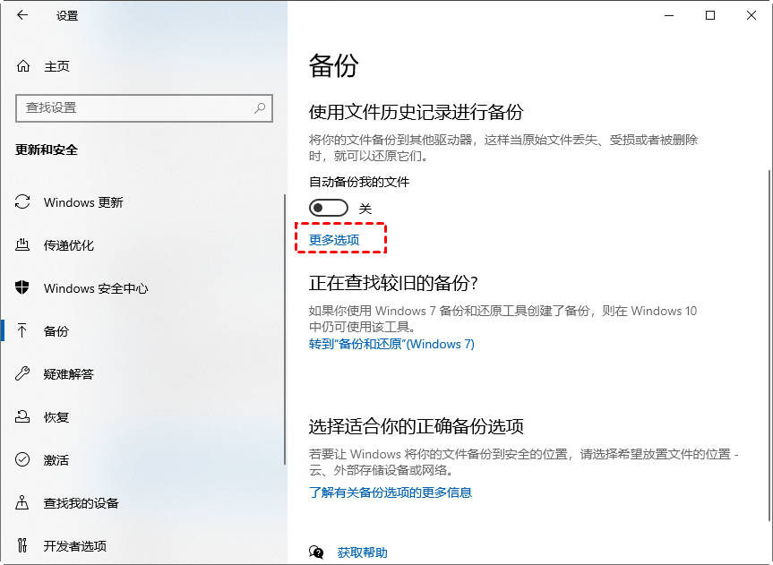 步驟2. 單擊“自動(dòng)備份我的文件”選項(xiàng)下的 “更多選項(xiàng)”。