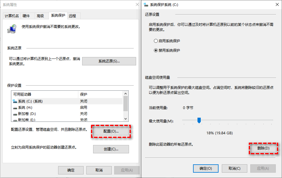 您可以在電腦桌面上右鍵點擊此電腦圖標(biāo),然后選擇“屬性”>“系統(tǒng)保護(hù)”,在保護(hù)設(shè)置窗口中選擇需要刪除還原點的驅(qū)動器(通常是C盤),然后點擊“配置”, 然后在彈出窗口中點擊下方的“刪除”按鈕即可刪除此驅(qū)動器的全部還原點。