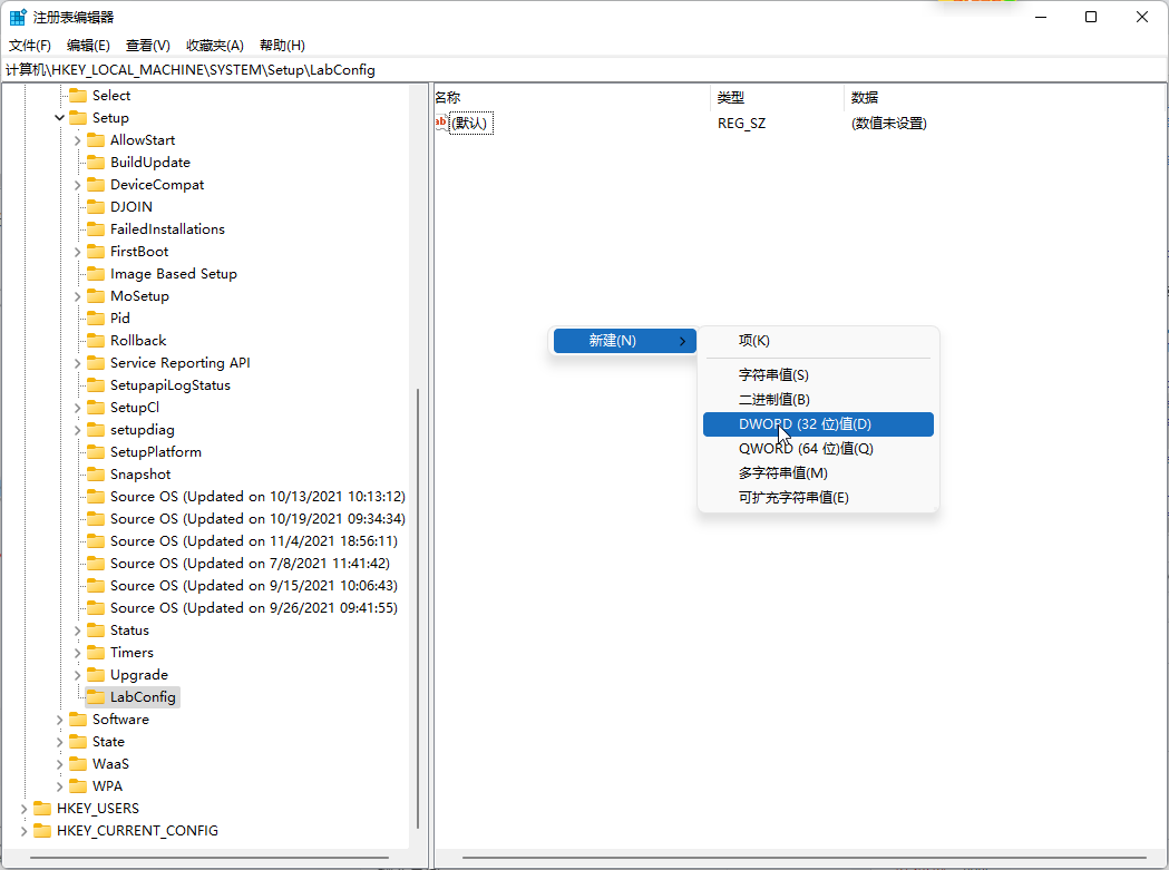步驟 4. 在 LabConfig 項(xiàng)下,右鍵單擊空白處以創(chuàng)建“DWORD (32位)值”選項(xiàng)以創(chuàng)建 新的 DWORD 值。