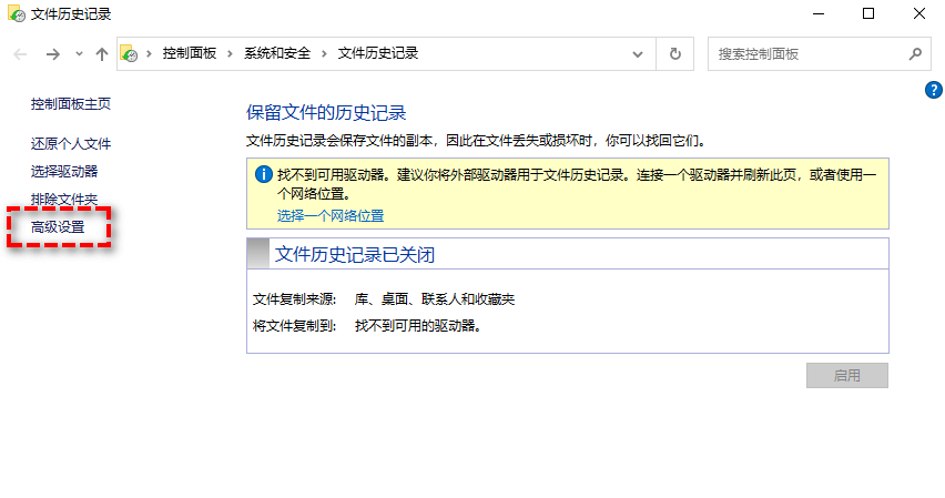 步驟2. 在控制面板中打開“文件歷史記錄”,然后單擊“高級設置”。