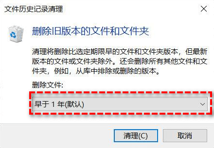 步驟4. 在文件歷史記錄清理窗口中選擇您想要刪除多久以前的文件歷史記錄(比如早于1年)。