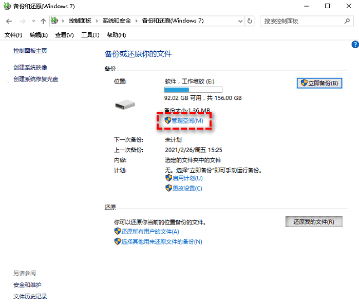 步驟1. 請您依次點擊“開始”>“設置”>“更新和安全”>“備份”>“轉到備份和還原(Windows7)”,然后選擇“管理空間”選項。