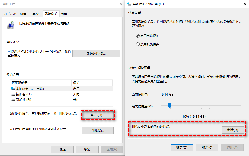 步驟2. 在彈出窗口中單擊“刪除”,然后點擊“應用”>“確定”即可刪除此驅動器上的全部系統(tǒng)還原點。
