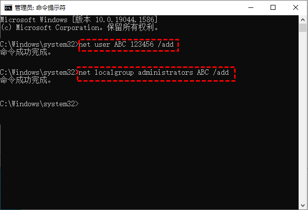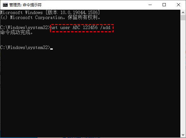 步驟2. 在運(yùn)行框中輸入“net user ABC 123456 /add”命令添加本地賬戶。其中“ABC”是用戶名,“123456”是登錄密碼,根據(jù)需要自行修改。