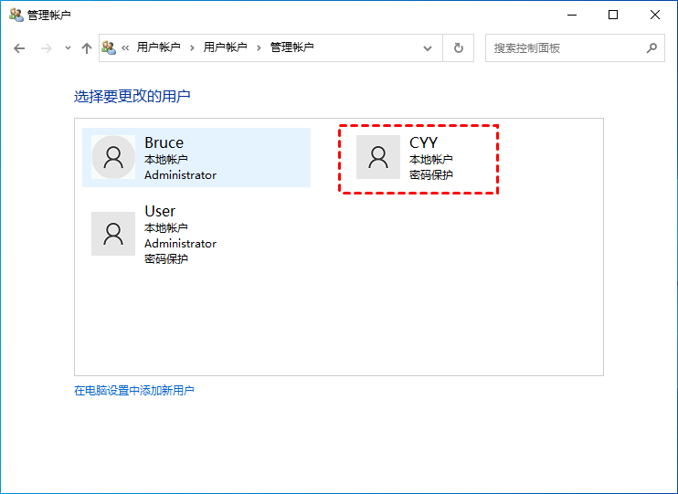 步驟3. 在新窗口中會(huì)列出已有的管理員賬戶和本地賬戶。點(diǎn)擊需要?jiǎng)h除的本地賬戶。