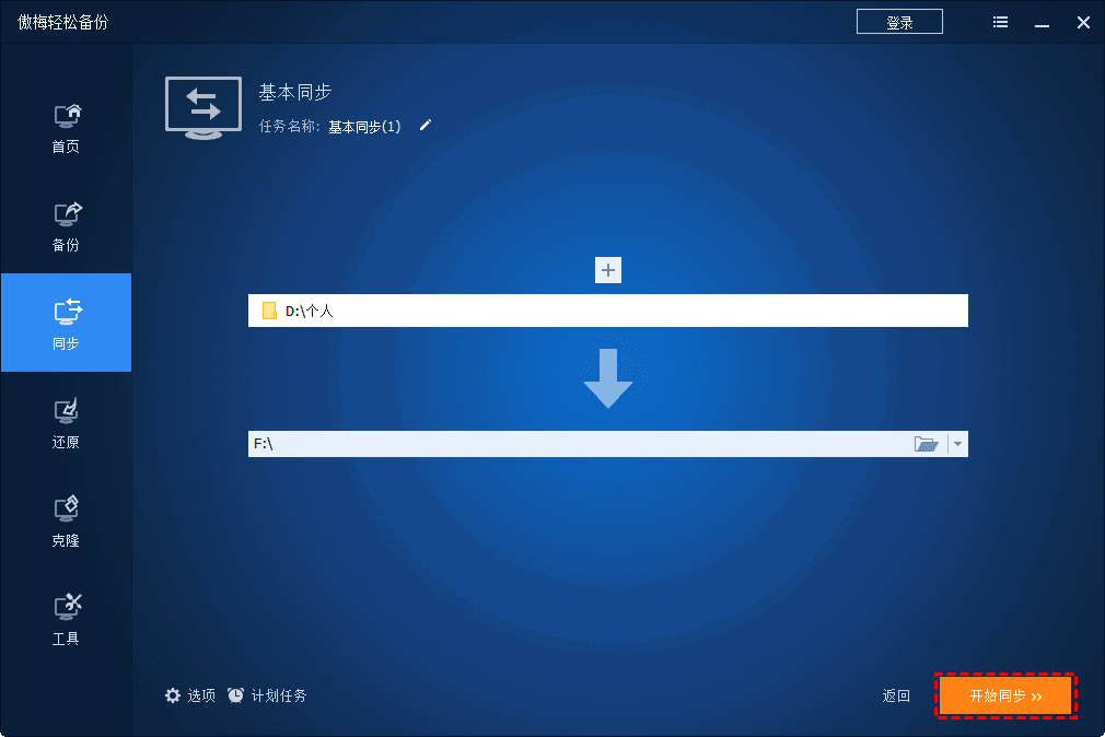 1.啟動(dòng)傲梅備份。單擊“同步”并選擇“基本同步”。
