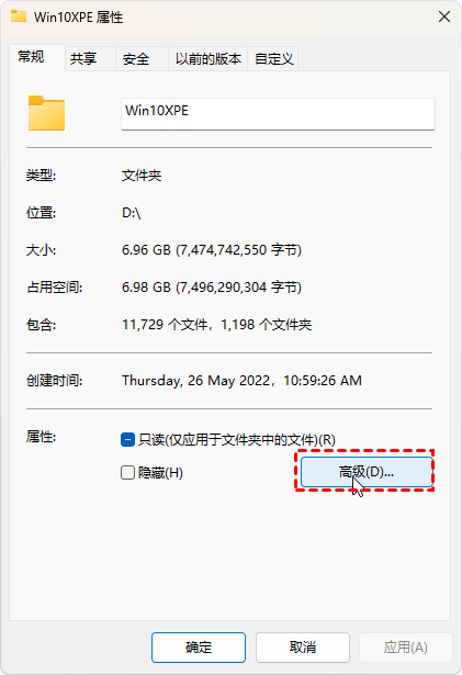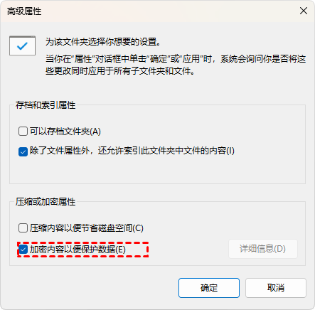 3.在高級屬性窗口中,勾選"加密內(nèi)容以便保護(hù)數(shù)據(jù)"選項(xiàng),并點(diǎn)擊"確認(rèn)"。