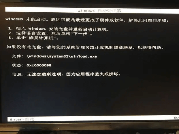 “我的老電腦上裝的是Windows 7操作系統(tǒng),在開(kāi)機(jī)的時(shí)候出現(xiàn)0xc0000098錯(cuò)誤。提示無(wú)法加載文件\windows\system32\winload.exe,因?yàn)閼?yīng)用程序丟失或損壞。出現(xiàn)錯(cuò)誤代碼0xc0000098怎么修復(fù)win7系統(tǒng)呢?有什么簡(jiǎn)單的解決辦法嗎?”