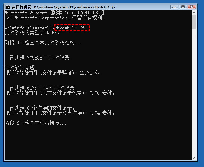 如果C分區(qū)有問(wèn)題文件系統(tǒng)、壞扇區(qū)等磁盤(pán)錯(cuò)誤,也可能出現(xiàn)0xc0000098錯(cuò)誤。因此,使用命令行工具檢查并修復(fù)磁盤(pán)錯(cuò)誤也是一個(gè)win7系統(tǒng)0xc0000098簡(jiǎn)單解決方法。