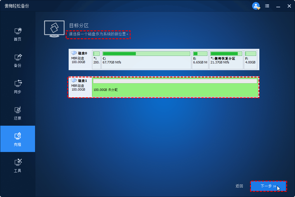步驟 4. Windows 運(yùn)行所需的分區(qū)將默認(rèn)包含在內(nèi),然后單擊“下一步”繼續(xù)。