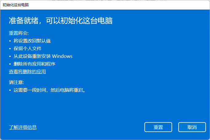 5. 確認(rèn)后,你需要等待一段時間,直到出現(xiàn)“準(zhǔn)備就緒,可以初始化這臺電腦”窗口。它會告訴你什么將被重置。單擊“重置”以執(zhí)行它。
