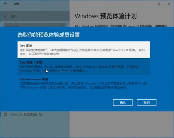 步驟4. 然后選取預覽體驗成員設置,選擇“Dev渠道”和“Beta渠道”都可以。并依次單擊“確認”選項,然后選擇“立即重啟”。