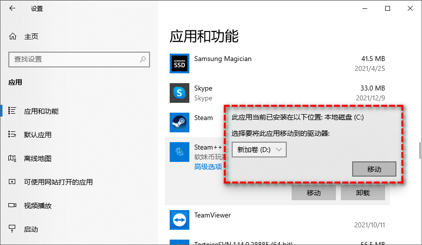 想要移動(dòng)程序到另一個(gè)驅(qū)動(dòng)器,我們還可以借助Windows系統(tǒng)自帶的應(yīng)用和程序功能,里面內(nèi)置了一個(gè)可以移動(dòng)程序的實(shí)用小功能。