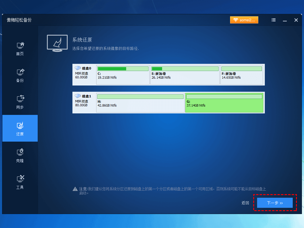 步驟5: 勾選“還原這個(gè)系統(tǒng)備份”和“系統(tǒng)還原到其它位置”,然后點(diǎn)擊“下一步”。