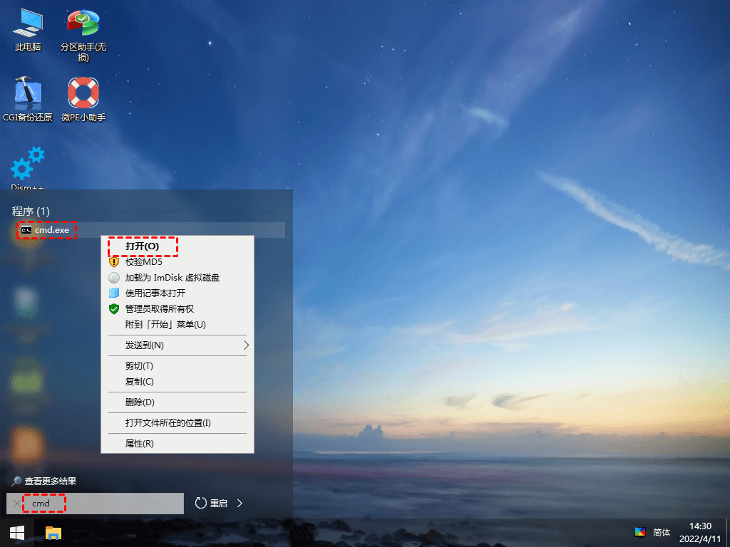 步驟1. 在PE系統(tǒng)中單擊左下角以管理員身份運行打開CMD。
