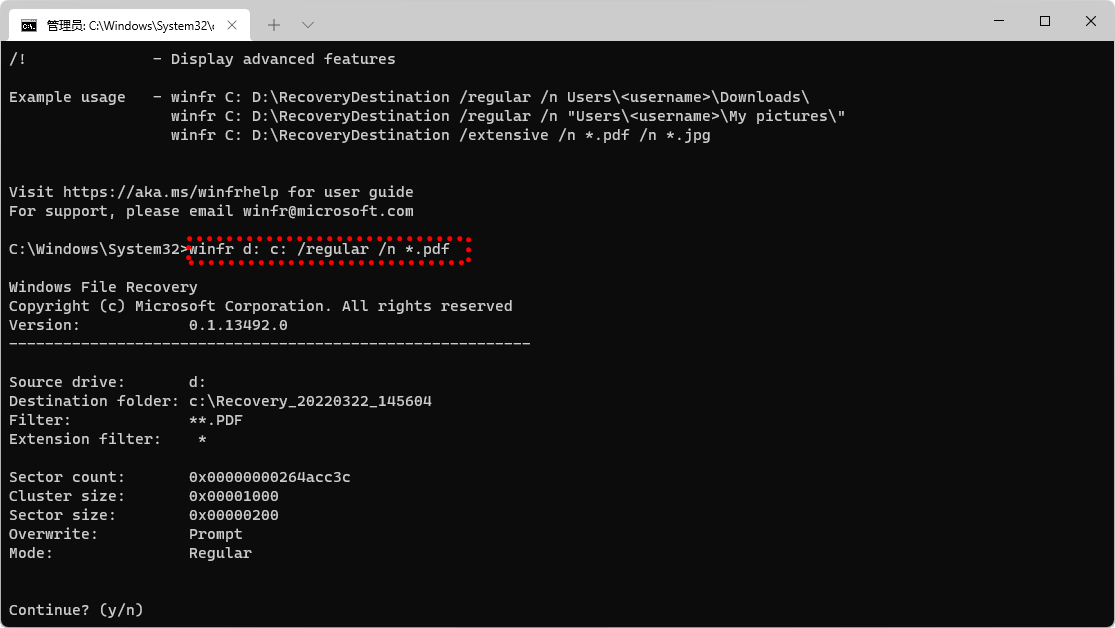 步驟 2 : 然后鍵入文件恢復命令。 命令格式: