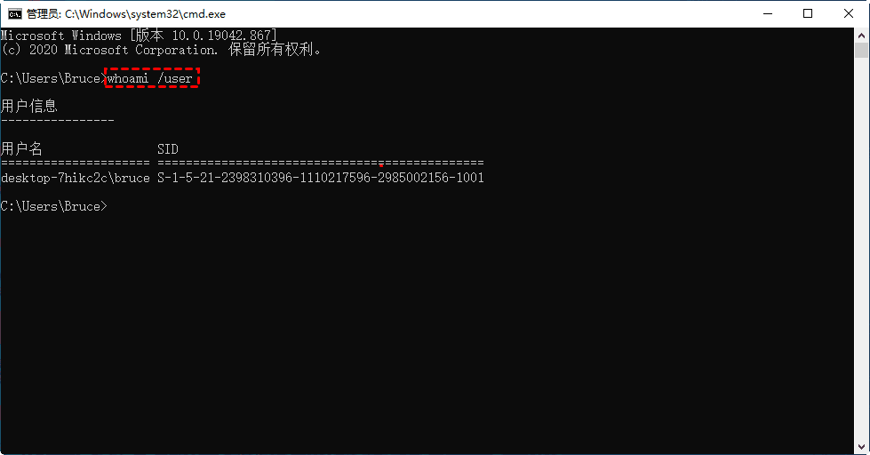 2. 輸入“whoami/user ” ,然后按Enter,然后你可以看到當(dāng)前帳戶的SID。
