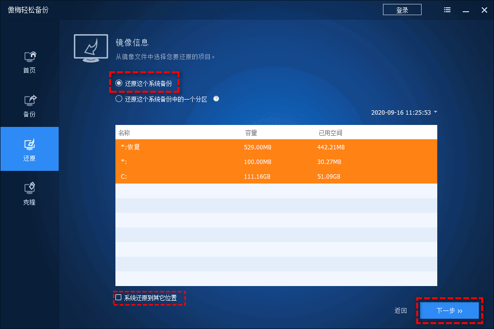 2. 在“鏡像信息”界面,勾選“還原這個(gè)系統(tǒng)備份”,點(diǎn)擊“下一步”。