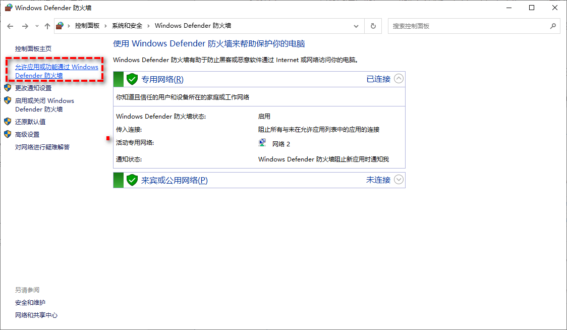 2. 依次單擊“系統(tǒng)和安全”>“Windows Defender防火墻”>“允許應(yīng)用或功能通過Windows Defender防火墻”。