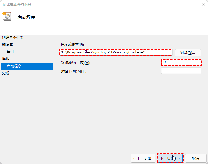 6. 在“程序/腳本”框中,輸入包括引號在內(nèi)的“C:\Program Files\SyncToy 2.1\SyncToyCmd.exe”。你也可以單擊“瀏覽”按鈕并找到SyncToyCmd.exe。在“添加參數(shù)”框中,輸入-R以每次運行所有同步。
