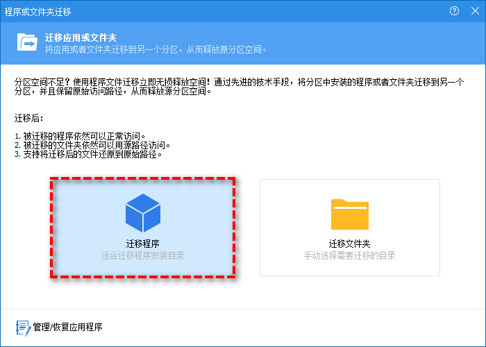 步驟2. 在彈出的選擇窗口中點(diǎn)擊“遷移程序”以開始配置軟件移動(dòng)到其他盤任務(wù)詳情。