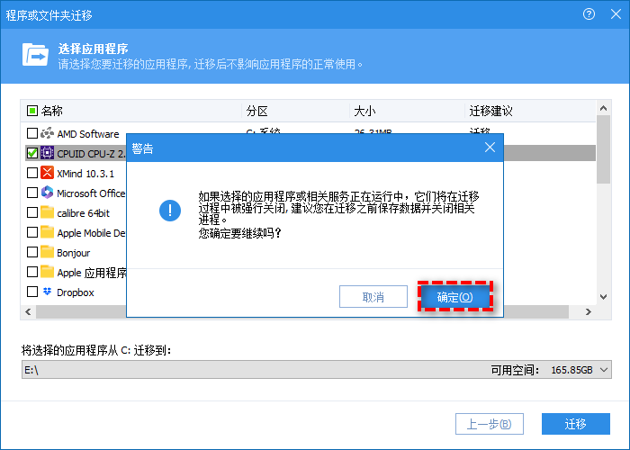 步驟5. 在彈窗提示中單擊“確定”即可開始移動(dòng)軟件到其他盤。