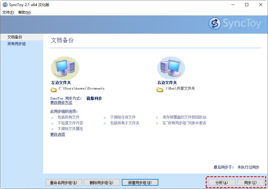 SyncToy會(huì)顯示一個(gè)任務(wù)摘要,包括所選的同步類(lèi)型和選項(xiàng)。點(diǎn)擊“完成”后,可以選擇“同步”以立即執(zhí)行同步任務(wù)。