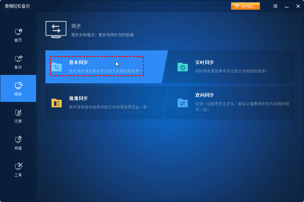1. 啟動(dòng)傲梅輕松備份,注冊(cè)并登錄您的賬號(hào),將其升級(jí)到VIP,在主頁上點(diǎn)擊“同步”,然后選擇“基本同步”。