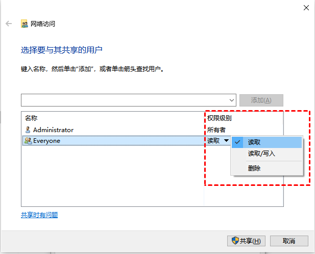 ? 讀取/寫入:表示用戶可以查看、打開、修改和刪除共享文件。