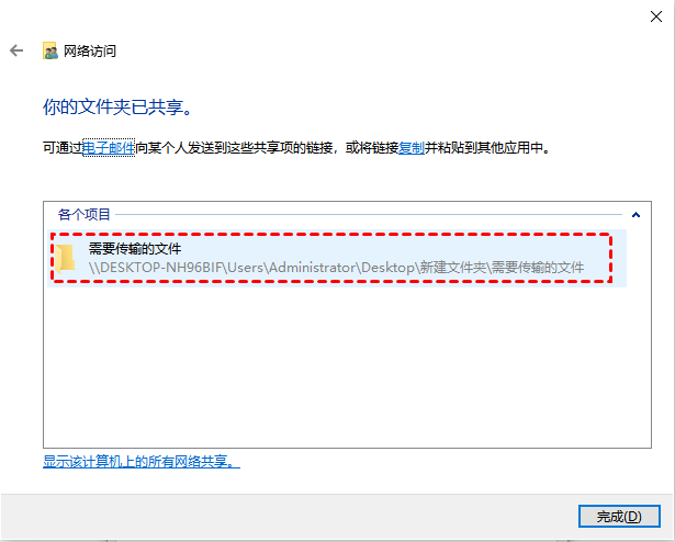 6. 記下其他用戶通過網(wǎng)絡(luò)傳輸大文件的網(wǎng)絡(luò)路徑,然后單擊完成。
