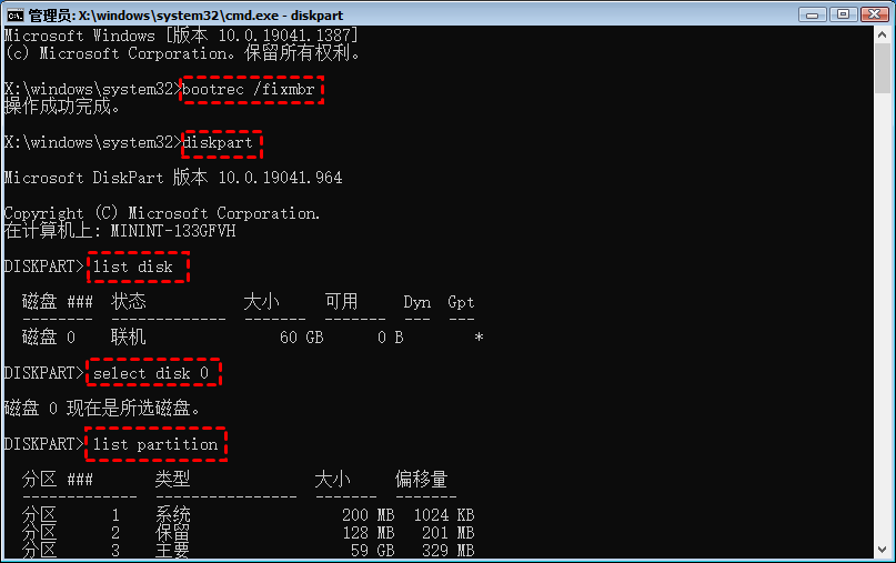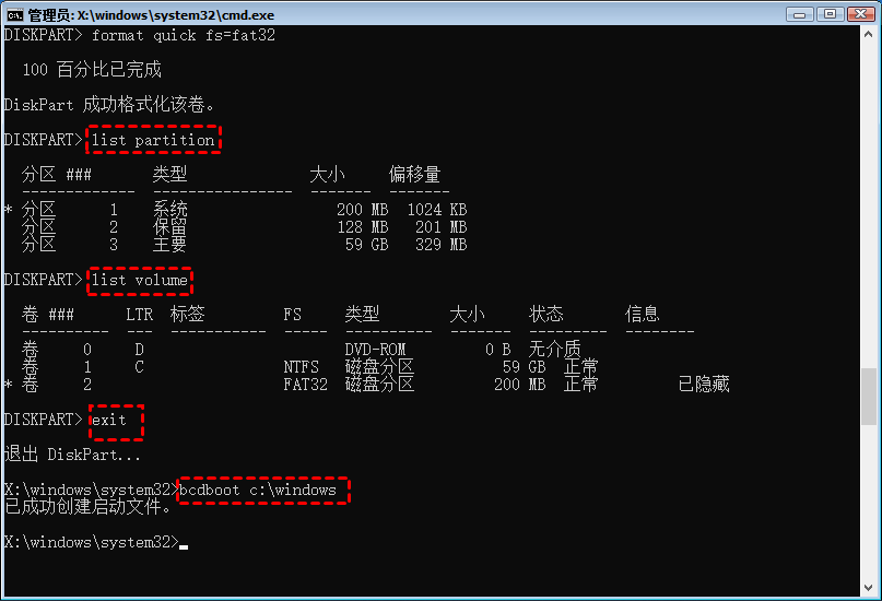 ? 注意:若從安裝盤啟動時,原來Windows系統(tǒng)的C盤在cmd中不一定顯示為C盤,要注意辨別原來的系統(tǒng)盤卷號。
