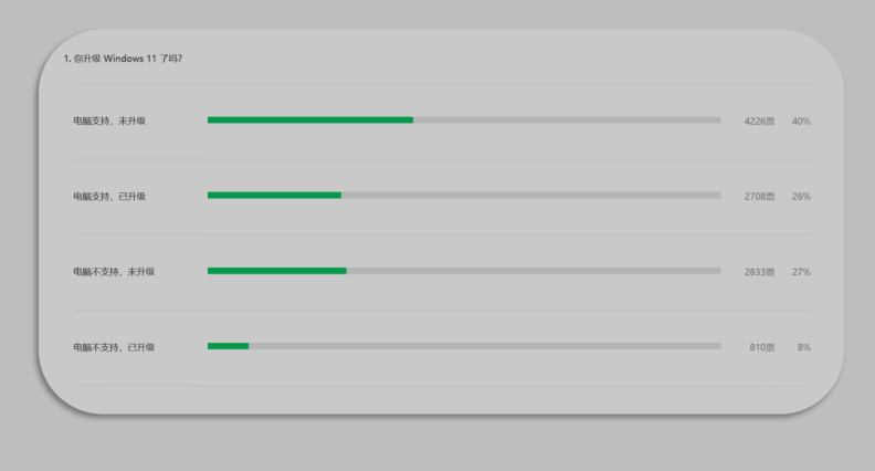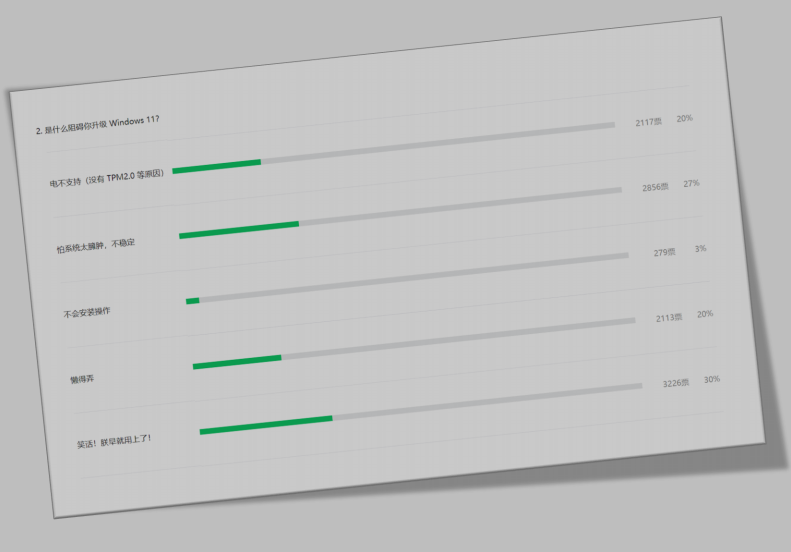 Windows 11發(fā)布已有一段時(shí)間,很多用戶的態(tài)度已經(jīng)從起初的觀望轉(zhuǎn)變?yōu)橄胍惭b。但是由于各種原因,至今還沒有成功上手Win11。以下是作者通過公眾號(hào)得到的統(tǒng)計(jì)數(shù)據(jù)。