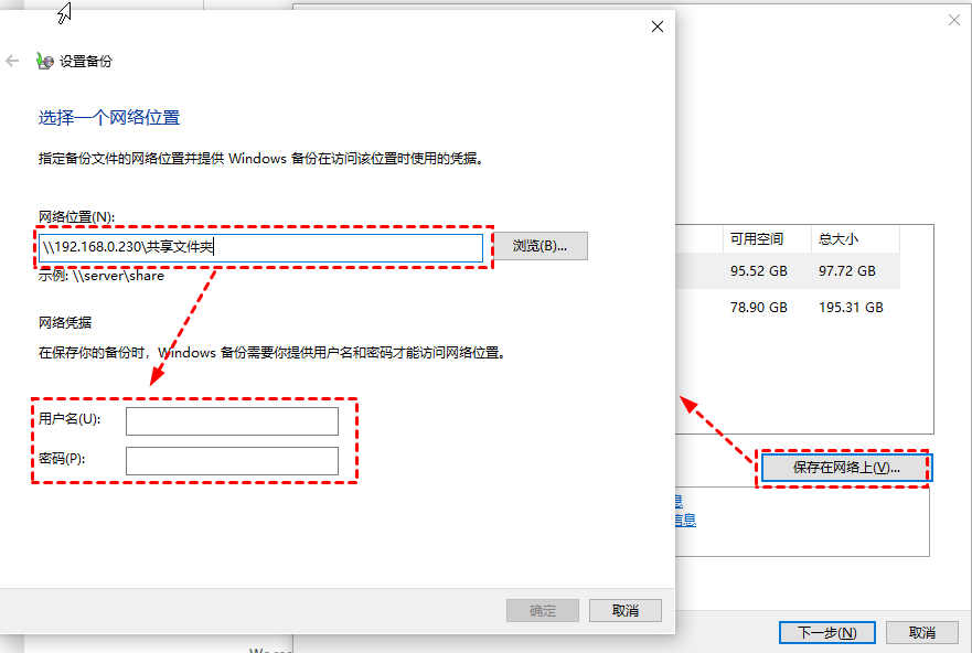 4. 選擇一個目標來保存您的備用映像。在這里,我們選擇“保存在網(wǎng)絡上”,然后輸入“網(wǎng)絡路徑”(IP地址),“用戶名和密碼”,然后單擊“確定”以選擇網(wǎng)絡作為目的地。