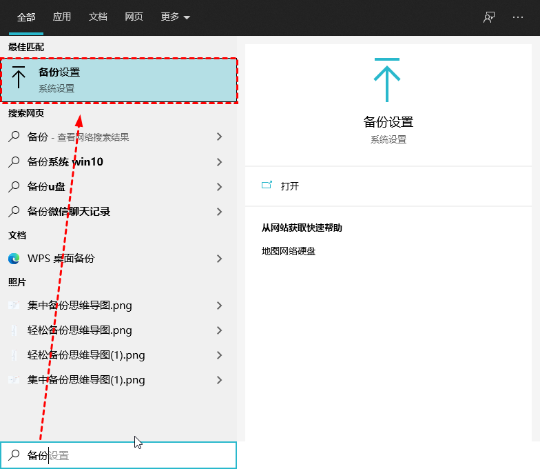 1. 在Windows 10的搜索框中輸入“備份”,在彈出的列表中選擇“備份設置”。