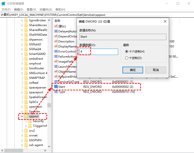 4. 單擊sppsvc文件夾,然后雙擊“開始”。將“數(shù)值”更改為4,然后按“確定”以禁用SPP服務。