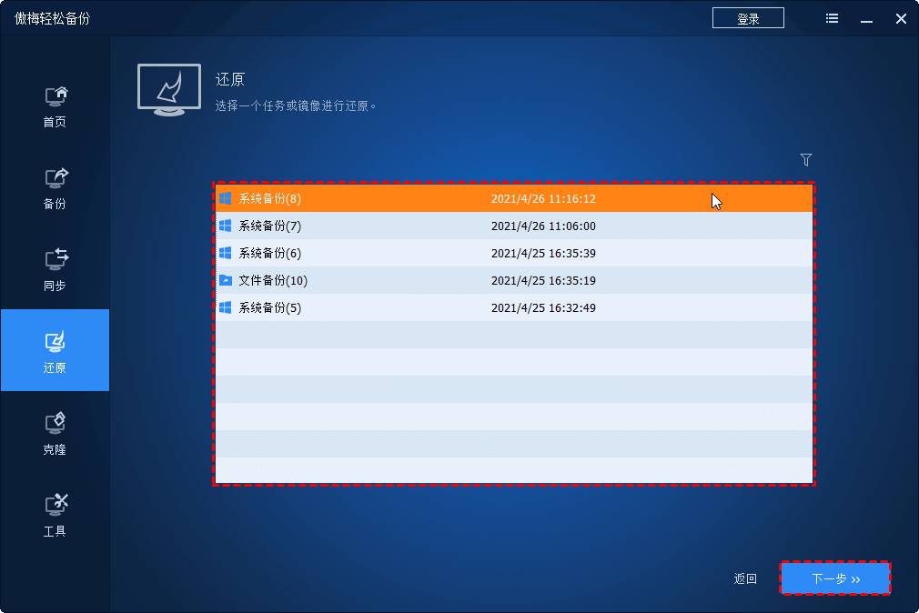如果您更喜歡一種免費且靈活的方法來修復(fù)系統(tǒng)錯誤且不丟失數(shù)據(jù),您可以試試這款免費軟件傲梅輕松備份來恢復(fù)Windows 10。它可以通過將Windows恢復(fù)到之前正常的狀態(tài)來解決您的問題,并且只有在該日期之后所做的數(shù)據(jù)改變才會被刪除。