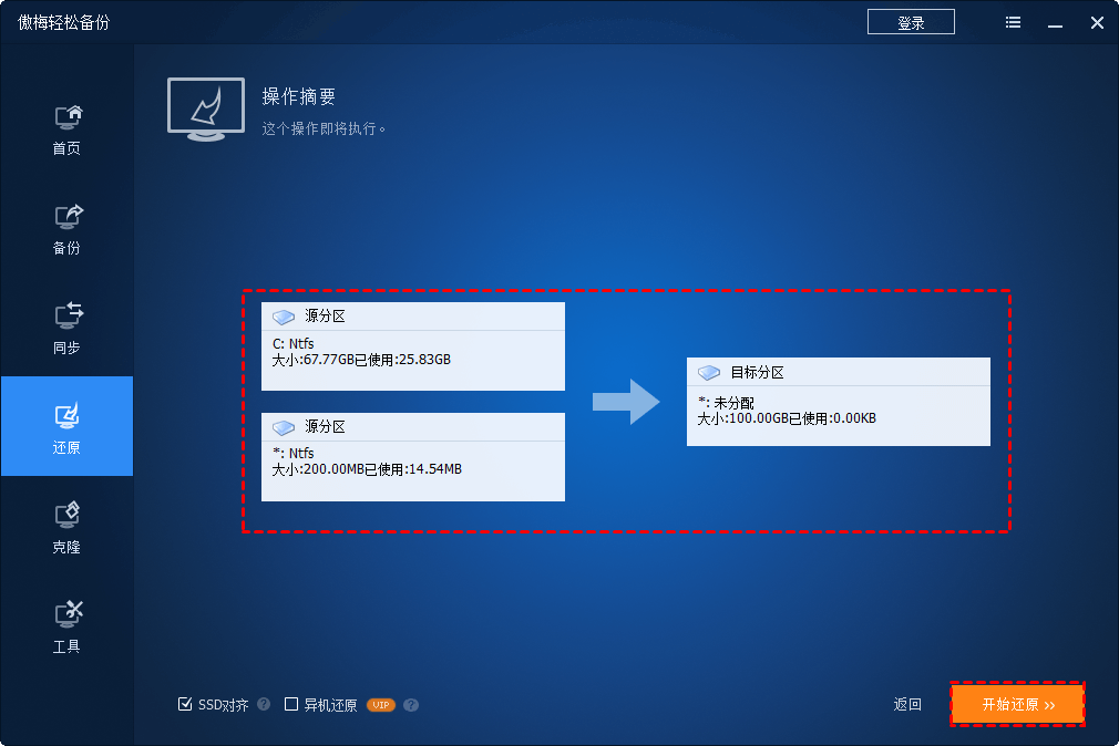 如果備份是在另一臺具有不同硬件的計算機上創(chuàng)建的,請勾選異機還原(VIP功能)以確保計算機在恢復(fù)后可以啟動。