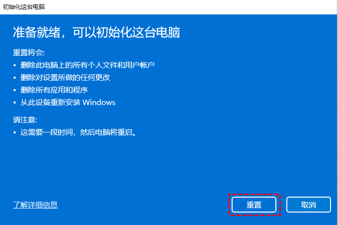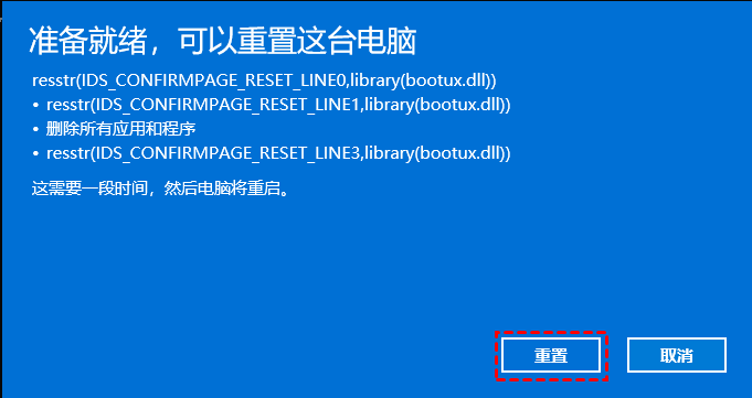 5. 一切準(zhǔn)備就緒后,您將看到如圖的頁面。Windows將根據(jù)您之前的選擇列出重置電腦的影響,仔細(xì)閱讀后,單擊“重置”,啟動Win10恢復(fù)出廠設(shè)置的程序。