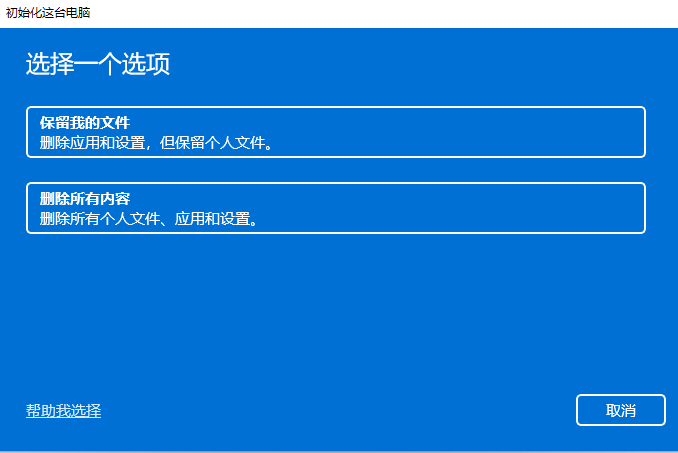 4. 選擇保留我的文件刪除所有內(nèi)容。如前所述,即使使用第一個選項,也不會保留您自己安裝的應(yīng)用程序和設(shè)置。