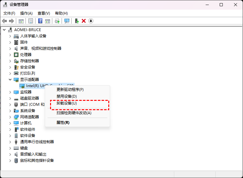 步驟 2. 找到并雙擊顯示適配器。右鍵單擊該項目并在展開的菜單中選擇卸載設備。