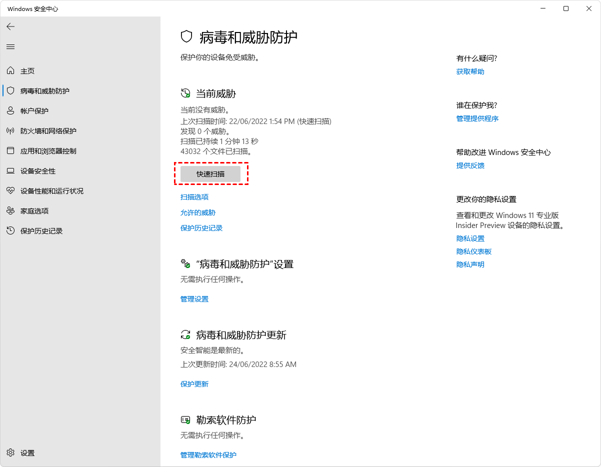 步驟 3. 在當前威脅部分,單擊快速掃描按鈕。