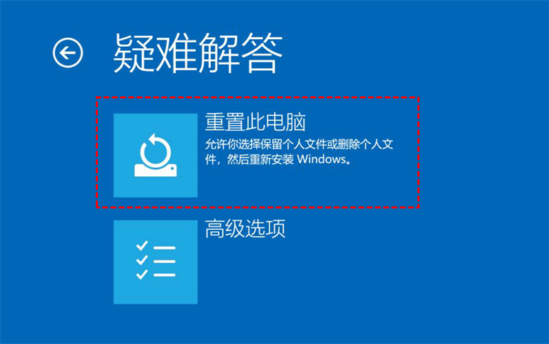 步驟 1. 進入Windows恢復環(huán)境,點擊疑難解答>重置此PC。