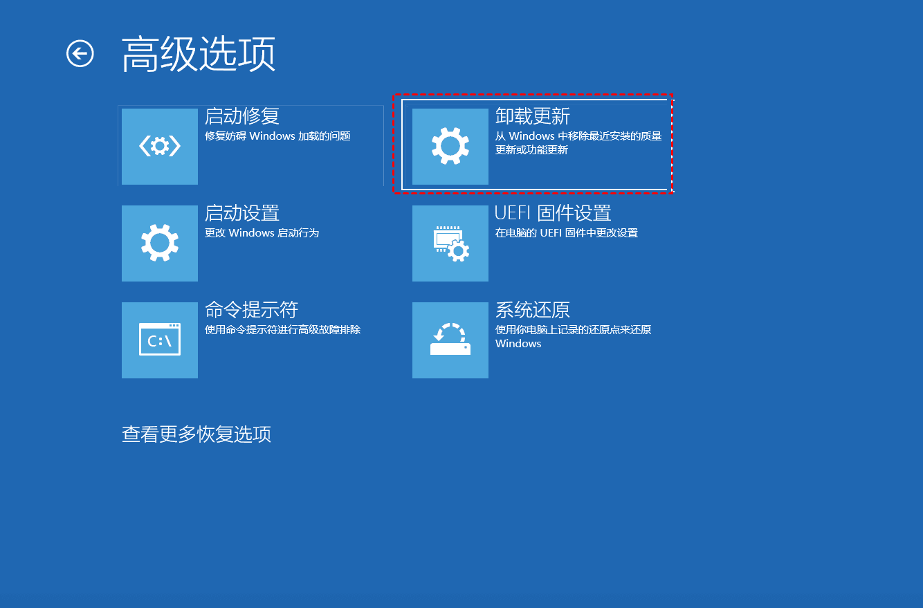步驟 1. 進入 Windows 恢復環(huán)境并單擊疑難解答>高級選項>卸載更新。