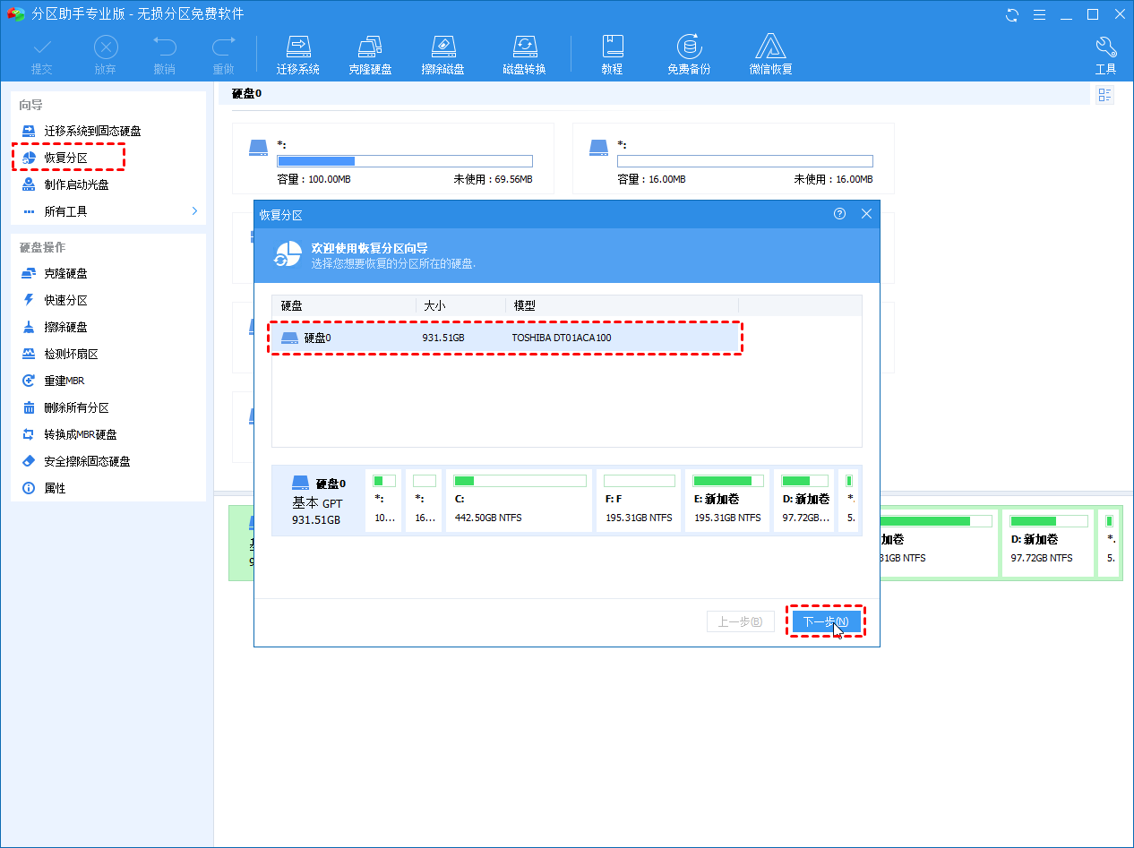 2. 然后選擇需要恢復(fù)刪除分區(qū)的硬盤,點(diǎn)擊“下一步”。
