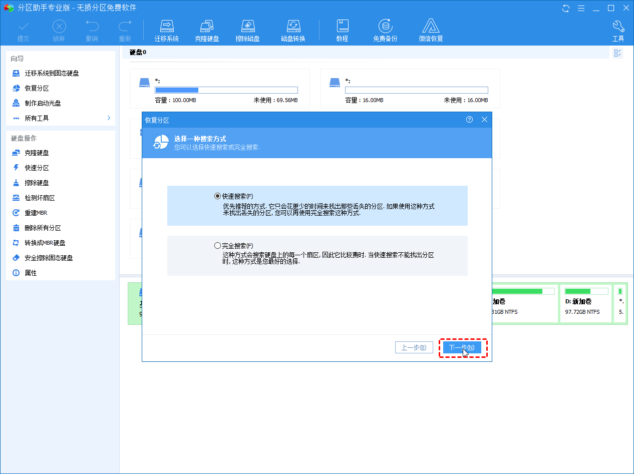 3. 選擇一種搜索方式:“快速搜索”或“完全搜索”。點(diǎn)擊“下一步”。