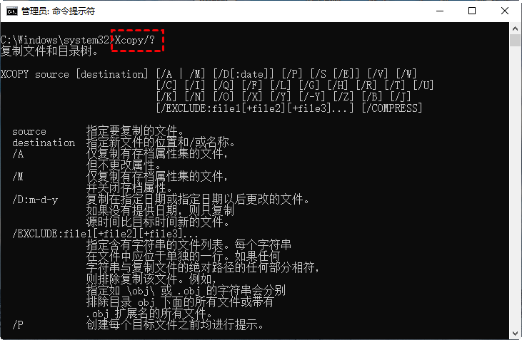 若想要查看Xcopy命令的各參數(shù)的使用說明,可以進(jìn)入命令提示符后輸入“Xcopy/?”查看Xcopy命令參數(shù)幫助。