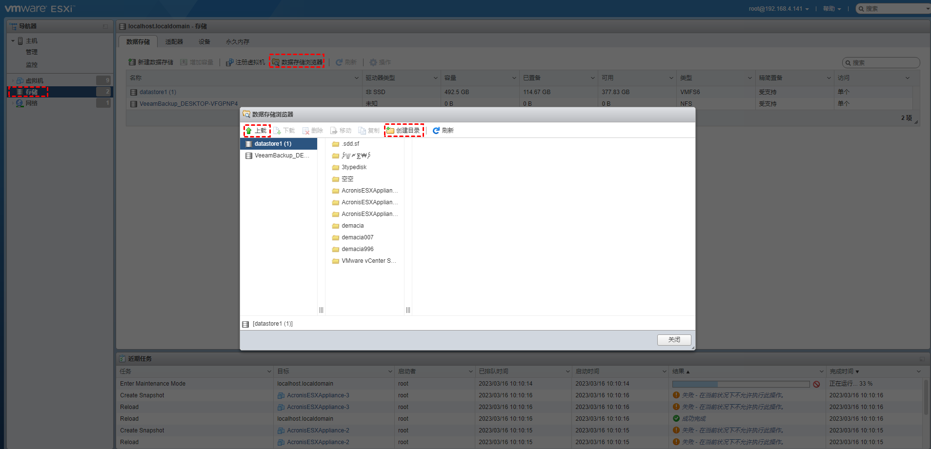 3. 導(dǎo)航到“存儲”>“數(shù)據(jù)存儲”>“數(shù)據(jù)存儲瀏覽器”,將下載的ZIP文件上傳到ESXi數(shù)據(jù)存儲。